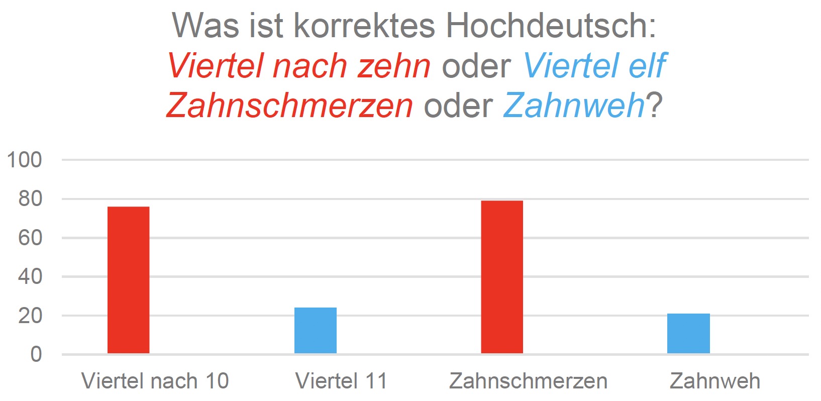 Die große Mehrheit hält die norddeutsche Variante Viertel nach zehn gegenüber der süddeutschen Variante Viertel elf für das "richtigere" Hochdeutsch.